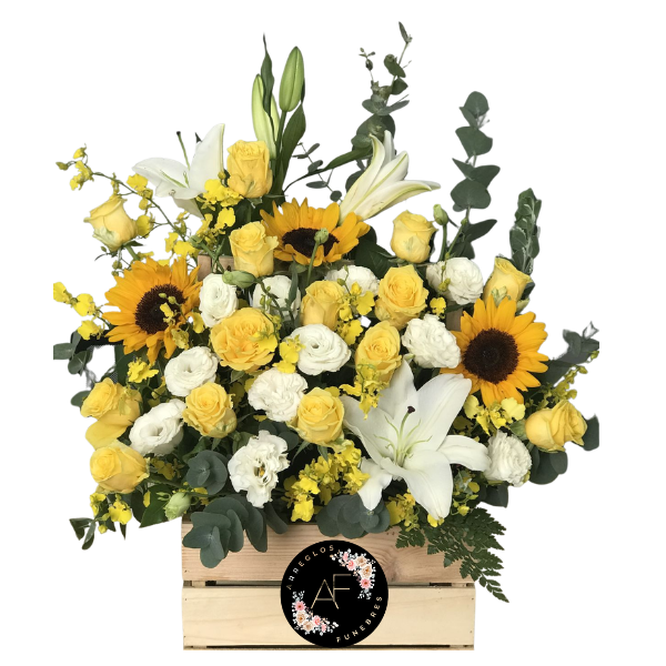 Fino arreglo en base de madera con mini rosas blancas y amarillas, 3 girasoles, lirios blancos y eucalipto.