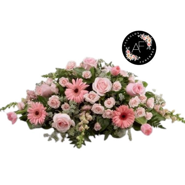 Fino cubre urnas con 10 rosas rosadas, mini rosas rosadas, verde de temporada y 5 gerberas .